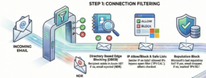 1. Connection Filtering: Checks sender reputation at the edge. If the sender is bad, the email is rejected immediately.