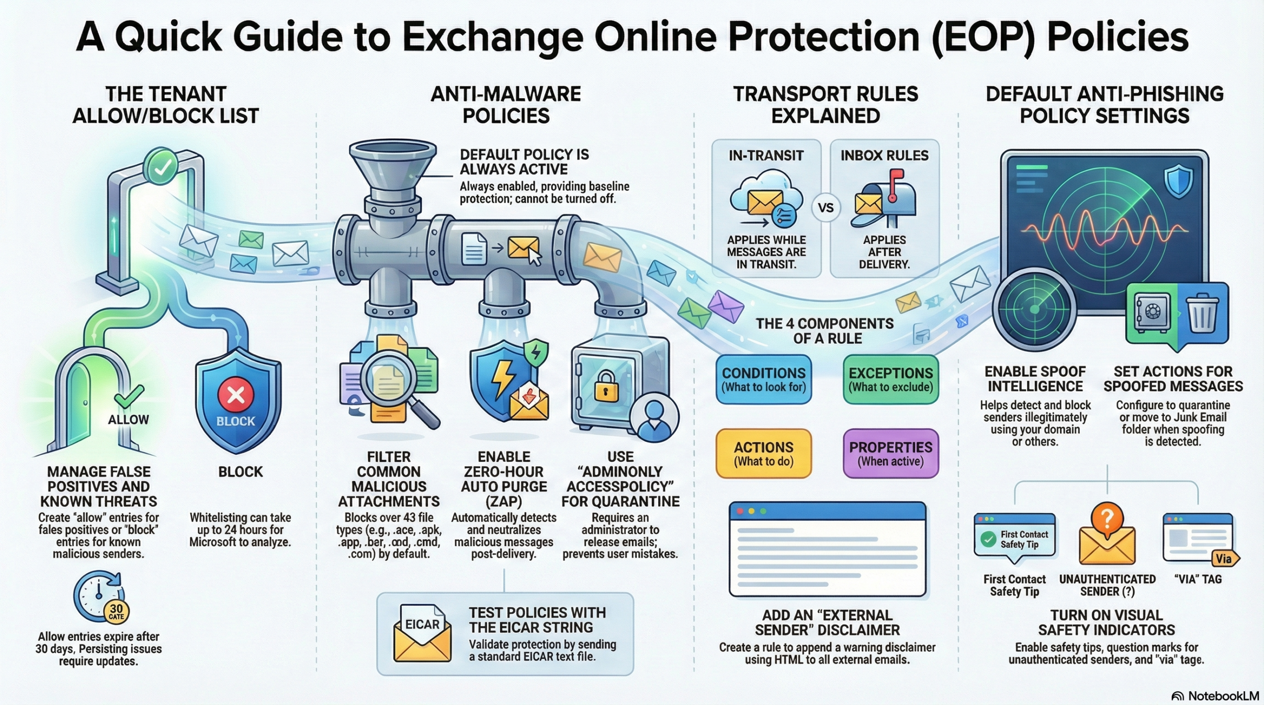This Quick Learner focuses on Exchange Online Protection (EOP), the cloud-based filtering service that serves as the backbone of email security in Microsoft 365. It covers the deployment and configuration of anti-malware, anti-spam, and transport rules to protect against phishing and malicious software.