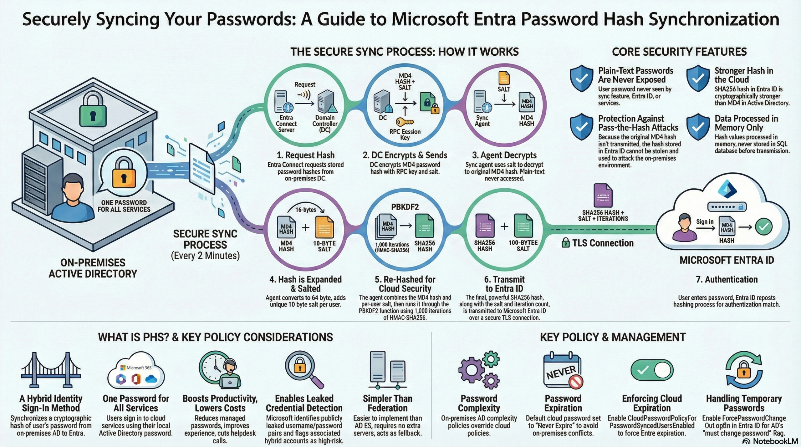- Cloud Storage: This secure, salted hash is synchronized to Microsoft Entra ID.